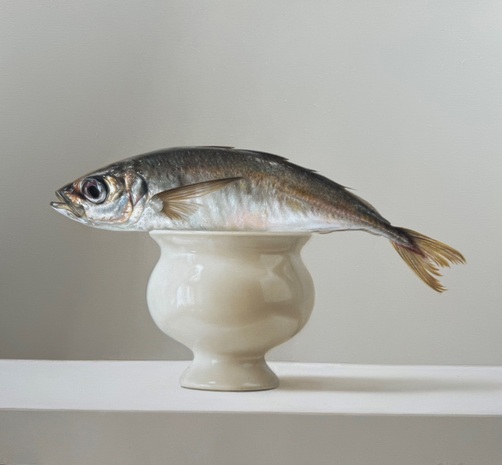 Fisch auf Schüssel, 2024, Öl auf Malplatte, gerahmt (Holz), 37 × 38 cm