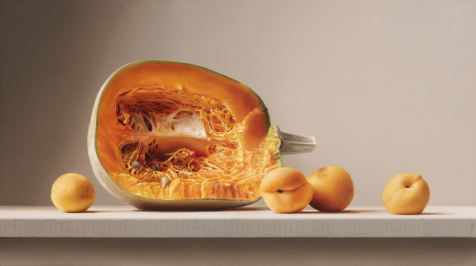 Kürbis und Aprikosen, 2023, Öl auf Malplatte, gerahmt, 33,6 × 60 cm