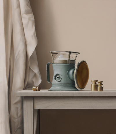 Laterne und Gewichte, 2023, Öl auf Malplatte, gerahmt, 64,4 × 55 cm