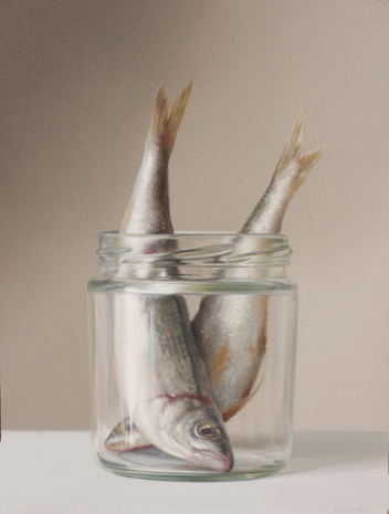 Sardinen im Glas, 2025, Öl auf Malplatte, gerahmt, 24 × 18 cm