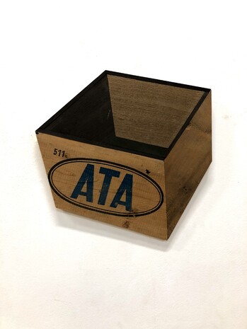ATA 511, 2022, originale Kistenteile, Furnier auf Sperrholz, 42 × 41 × 1,5 cm