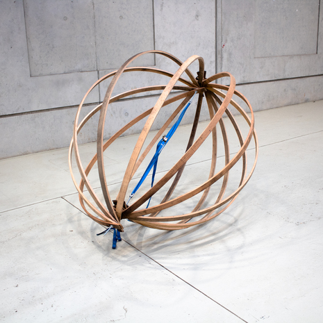 Faltkugel, 2021, verleimte Buchenleisten, Gewindestange, Zurrband, 130 × 130 × 200 cm