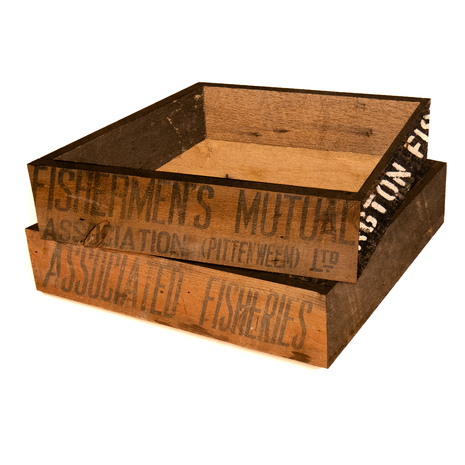 Fishermen’s Mutual, 2022, Originale Kistenteile, 52 × 72 × 2 cm