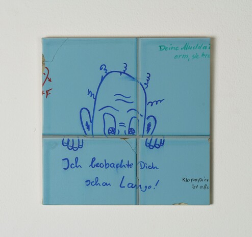 Fliesenstück "Ich beobachte dich", 2023, Öl/Acryl auf Leinwand, 25 × 25 cm