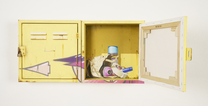 Hab & Gut Gelb Graffiti, 2022, Öl, Acryl auf Holz und Leinwand, 34 × 70 × 9 cm