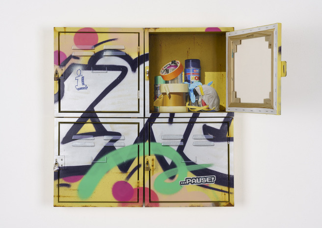 Hab & Gut "I Love Pause", 2023, Öl/Acryl auf Leinwand, Collaberation CURT Rayk Amelang, 4-tlg., 1 Spind innen bemalt, 70 × 70 × 9 cm