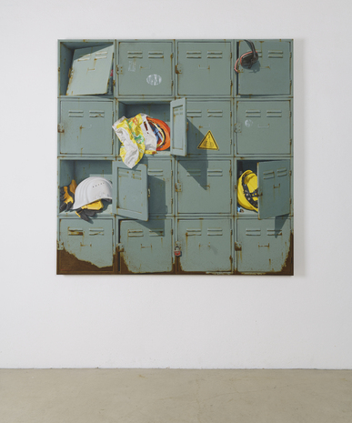 Spinde (Helme), 2023, Öl/Acryl auf Leinwand, 140 × 140 × 7 cm
