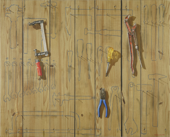 Werkzeugbrett, 2020/21, Öl/Acryl auf Leinwand und Holz,, 100 × 80 cm