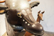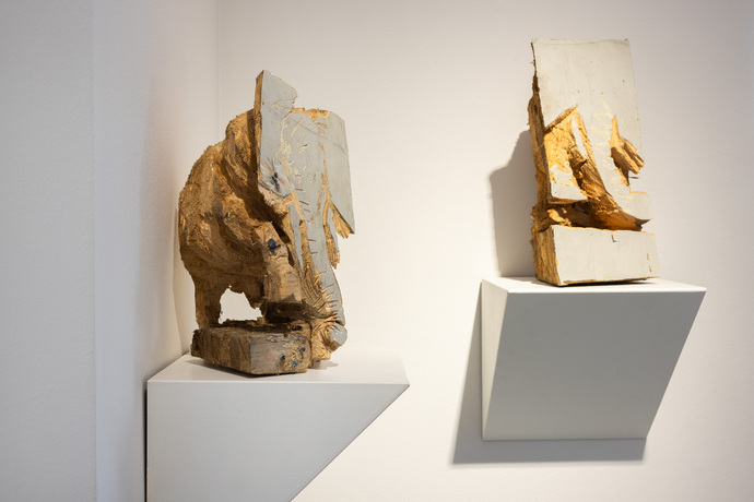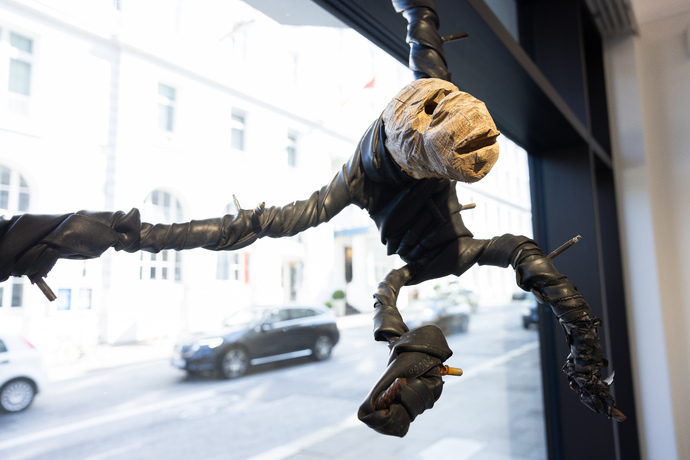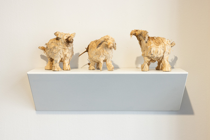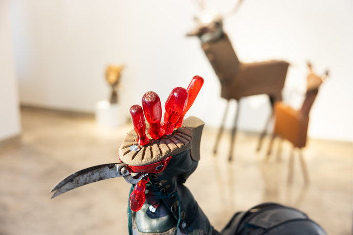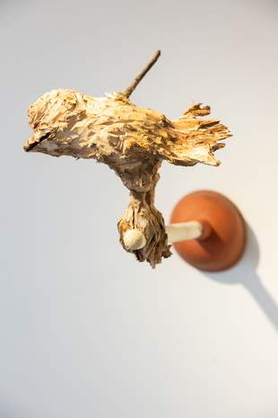 Der Stuttgarter Künstler Thomas Putze, geb. 1968, findet nicht nur industriell gefertigte Zivilisationsreste, sondern auch Holzabfälle: abgeschnittene Äste, herausgebrochene Fensterrahmen, Zaunpfosten und dergleichen. In Ihnen sieht er versteckt einen Frosch oder Vogel lauern und holt sie holzbildhauerisch heraus. Neben der skulpturalen Arbeit interessiert sich der Künstler für die Materialgegensätze, die er lustvoll miteinander kombiniert. Es entstehen Mischwesen aus Holz und Zivilisationsabfällen. Hals über Kopf stürzen sich Thomas Putzes Figurenerfindungen ins Leben. Selbstbewusst stellen sie sich ihrem Schicksal entgegen, behaupten sich und lassen offen, ob die vermeintlichen Ersatzteile ein Handikap oder ein Hilfsmittel darstellen.