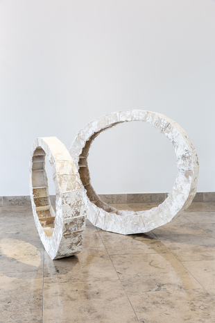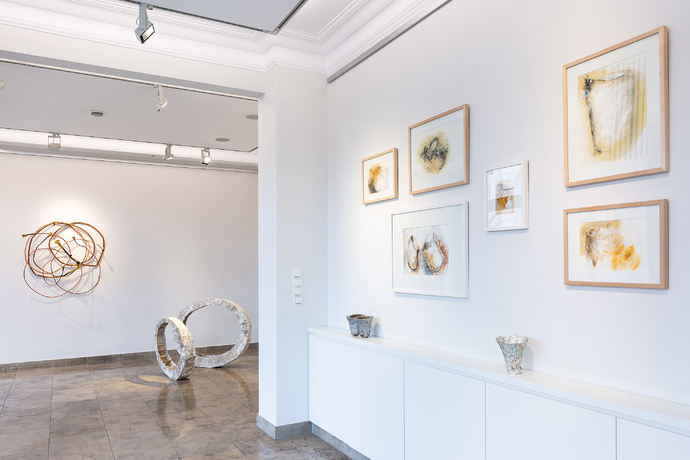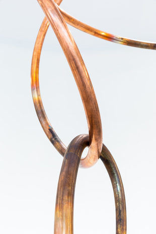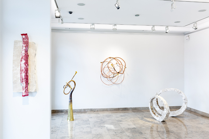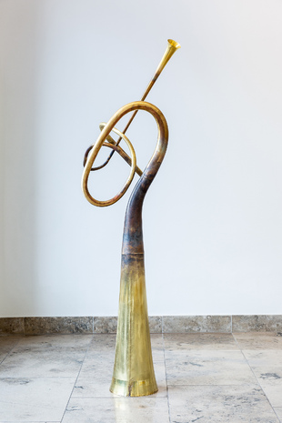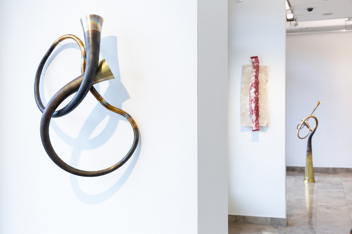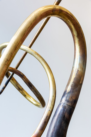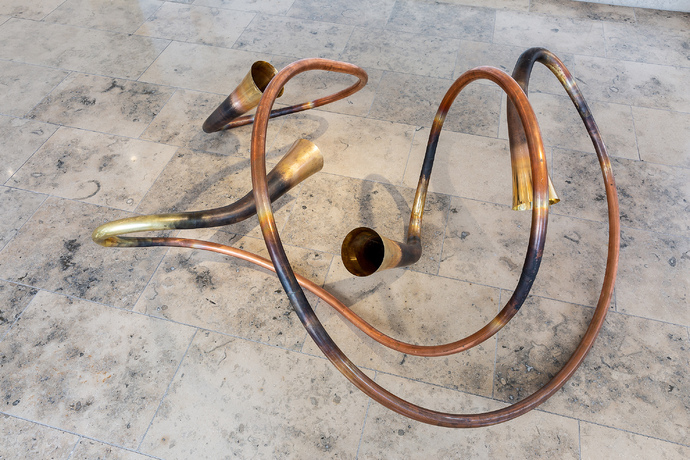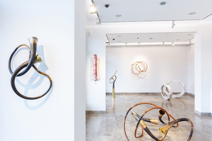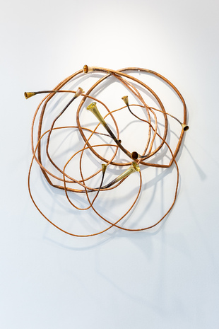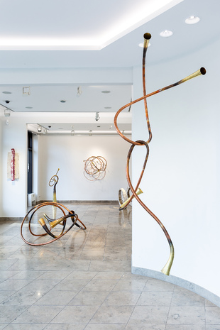 Anja Michaela stellt in der Ausstellung eine neue Werkserie vor, die an Musikinstrumente erinnert. Und tatsächlich bestehen die Werke aus Metallteilen, die zur Herstellung von Blasinstrumenten verwendet werden. Die Künstlerin verarbeitet diese zu neuen „Instrumenten“, kombiniert disparate Einzelteile, verlängert sie, lässt sie sich winden – fast so, als seien sie froh, ihrer Bestimmung zu entkommen und sich nun frei zu entwickeln: Partner zu finden, neue Klänge zu erproben, den Raum zu erobern … Dabei sind die neuen Objekte so perfekt gearbeitet, dass man sie als glaubhaft empfindet. Ihre Windungen sind teils labyrinthisch und verwirrend, ganz wie bei realen Musikinstrumenten, die man aus der Erinnerung kaum richtig nachzeichnen kann. So sind Anja Michaelas Werke auch eine Metapher für die sich verselbständigende Erinnerung. Ihre Instrumente lassen Töne im inneren Ohr des Betrachters entstehen, sie tragen unsere Erinnerung an Musik in sich. Diese und andere Werke ihres vielschichtigen, poetischen Œuvres werden in einer raumfüllenden Inszenierung präsentiert.