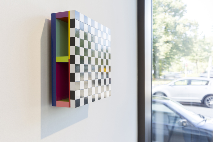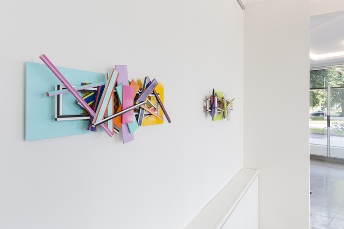 Dieter Balzer steht in der Tradition der konkreten Kunst. Er zerschneidet MDF-Platten und konstruiert daraus streng geometrische, architektonisch anmutende Objekte für Wand und Raum. Sie heißen Horizontale, Orthogonale oder Konjunktion. Diese beklebt Dieter Balzer mit Farbfolien, die in ihrer Passgenauigkeit die Verstrebungen der MDF-Konstruktionen zwar nachbilden, diese in ihrer Farbigkeit aber konterkarieren. Das Eigenleben der Farbe hebt so die Materialität des Objekts auf und überführt den Gegenstand ins Geistige, Konkrete.