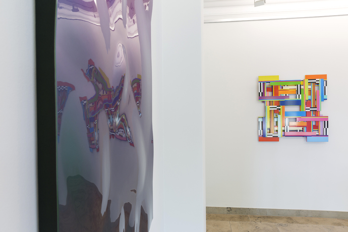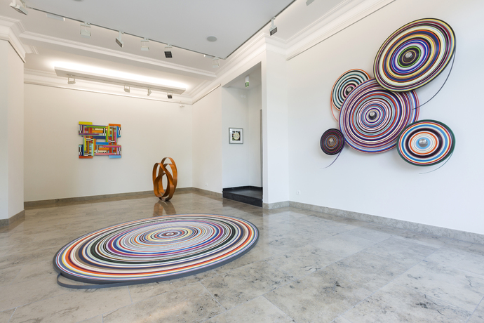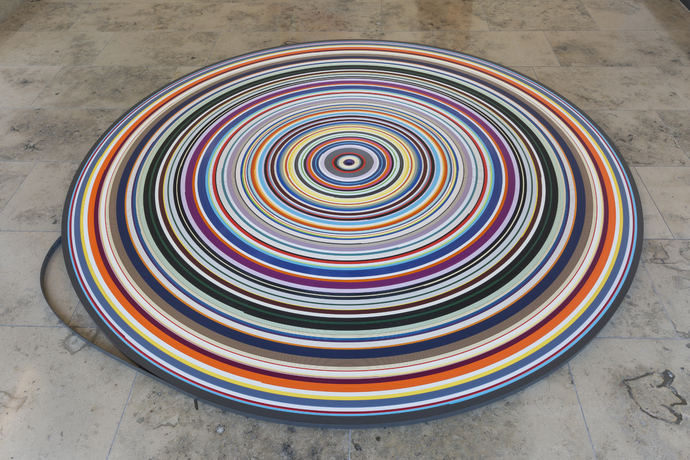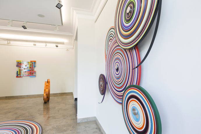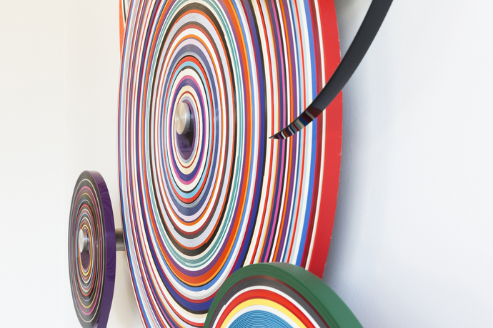 Jürgen Paas stellt seine neue TARGET-Serie vor. Farbige PVC-Bänder fügen sich spiralförmig aneinander zu plastischen Wand- und Bodenobjekten. Grundsätzlich dem Minimalismus verhaftet, bleibt Jürgen Paas in der Form stets klar und geometrisch. Zusätzlich verleiht er dem Objekt aber in der Farbigkeit malerische Qualitäten, die ins Psychedelische gleiten. Der Gegenstand wird gleichzeitig mit psychologischen wie technischen Assoziationen verknüpft und so inhaltlich aufgeladen.