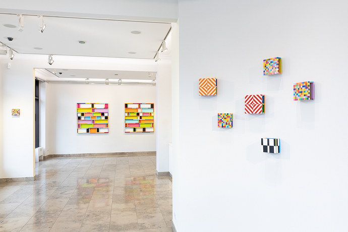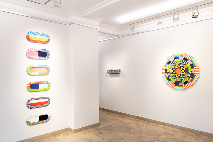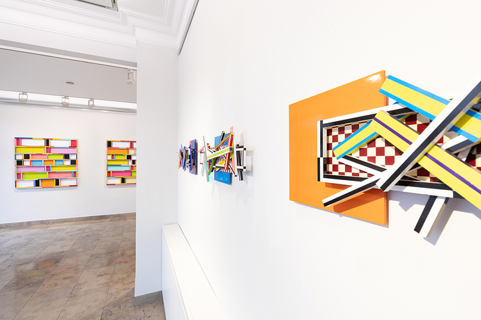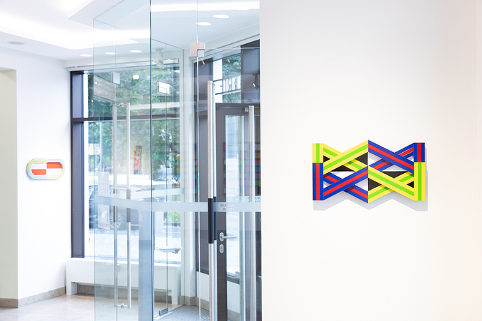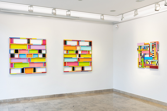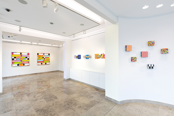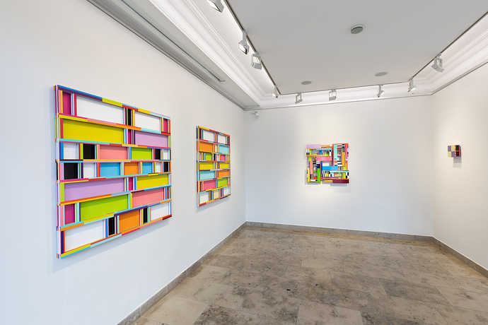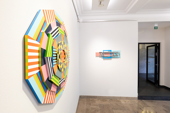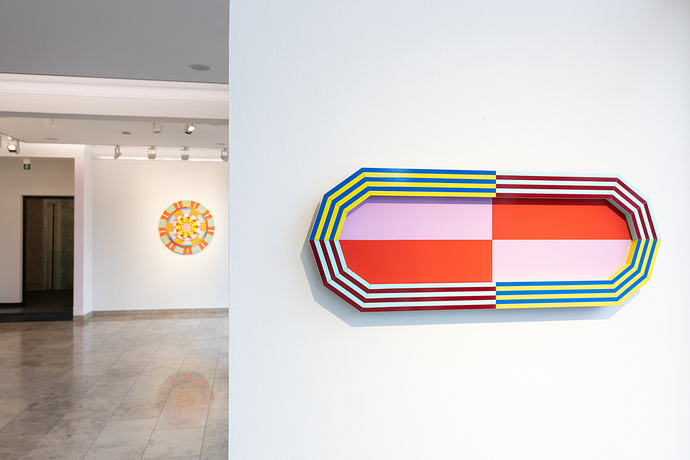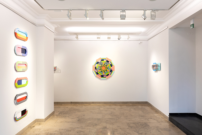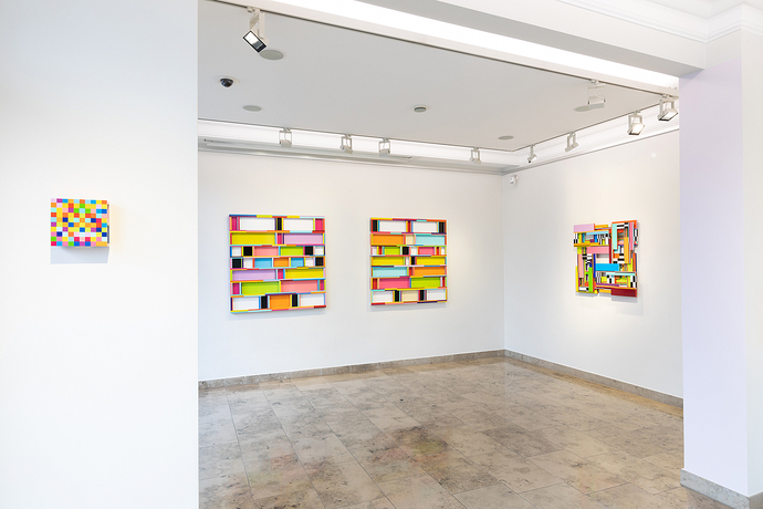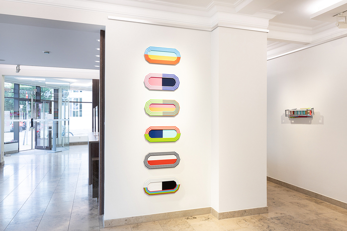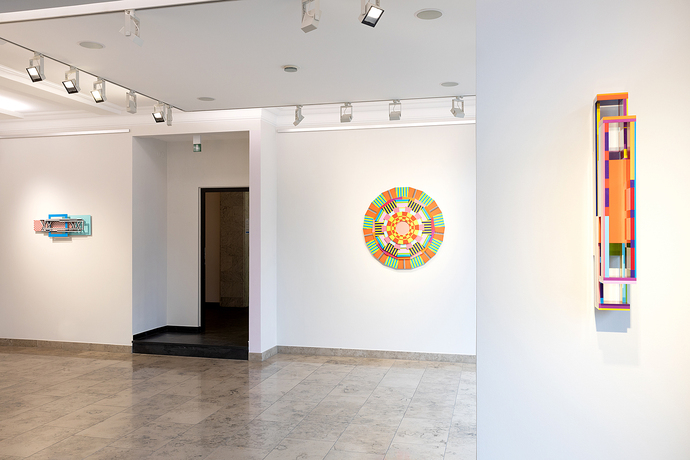 Die Einzelausstellung POLYCHROME in der Stern-Wywiol Galerie zeigt Exponate verschiedener Werkgruppen, die sich zu einer Gesamtinstallation verbinden und mit der Architektur des Raums in Beziehung treten.