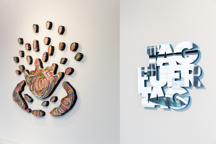 Babak Saed - sein Thema ist Kommunikation. Er beschäftigt sich mit dem geschriebenen Wort, verfremdet es durch Groß- und Zusammenschreibung und macht uns dadurch den Vorgang des Lesens bewusst. Er verwendet Sprache als „Bild“ und knüpft damit an die westliche Konzeptkunst an und an die durch die Tradition der Schriftwerbung geschulten visuellen Gewohnheiten des Betrachters. WORT