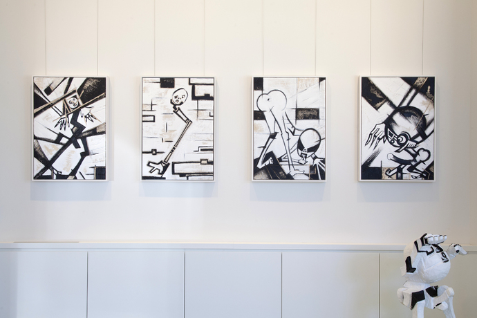 Da ist Nõ, ihre meditative Körperhaltung mutet asiatisch an, macht sie Schattenboxen oder eine Karateübung? Da ist der kleine Play Boy, dessen Gesichtszüge aus Quadraten und Kreisen bestehen, er geht herausfordernd und angriffslustig mit Zeigefinger und Penis auf den Betrachter zu.