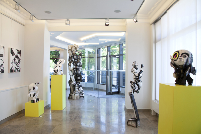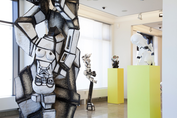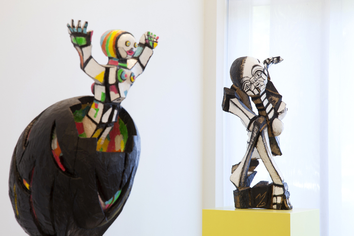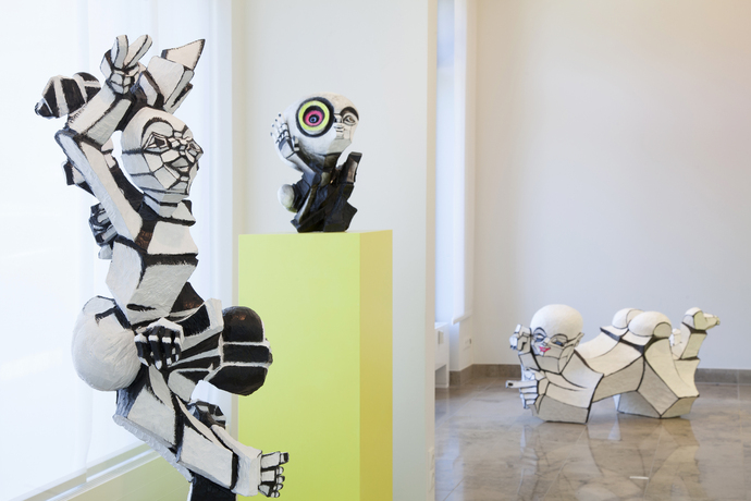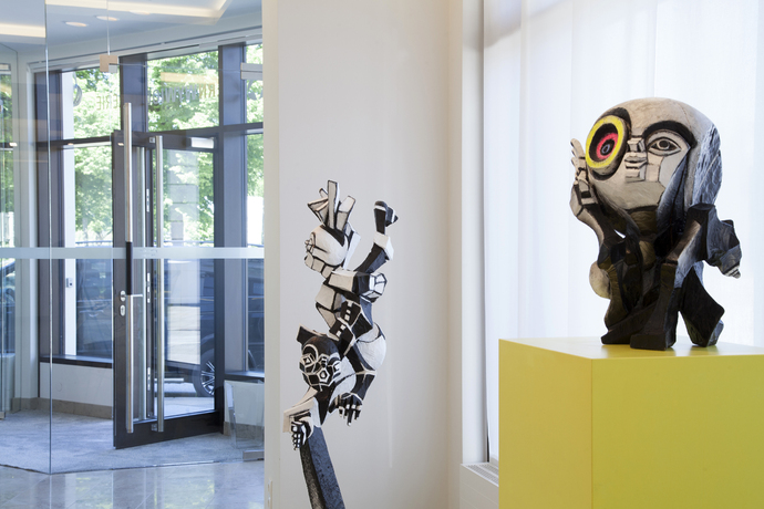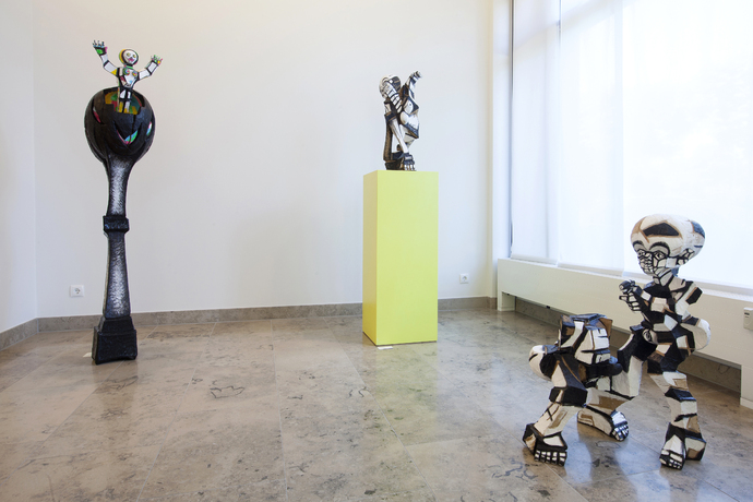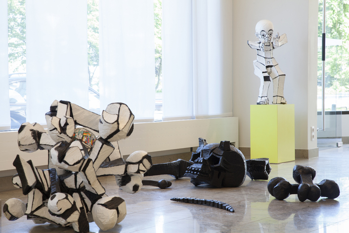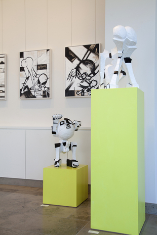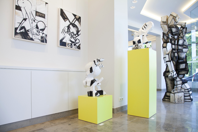Die schwarz-weiße Farbe verleiht den Figuren Zeichenhaftigkeit, die schwarz gezeichneten Kanten und weißen Flächen wirken wie zweidimensionale Skizzen. Schwarz und Weiß, Skulptur und Zeichnung, das scheinen nicht die einzigen Gegensätze zu sein.