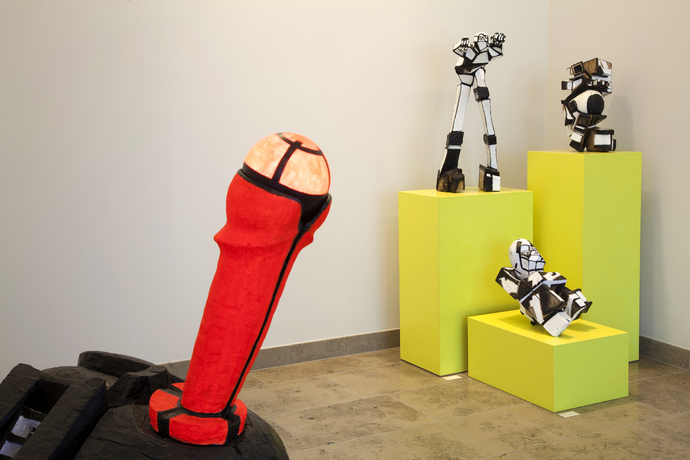 Wer sich vermeintlich an Spielzeug erinnert fühlt, erlebt eine Täuschung, die sexuell aufgeladenen Figuren verführen den Betrachter auch in der Materialität, was leicht erscheint, ist tatsächlich ein massives Stück Holz.