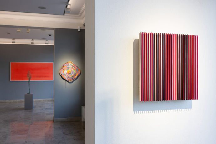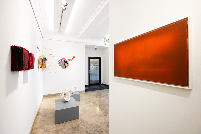 In der Aufstellung stehen ein rotes und blaues Werk zusammen, wie Frau und Mann, sie glänzen und leuchten wie ein glückliches Paar.