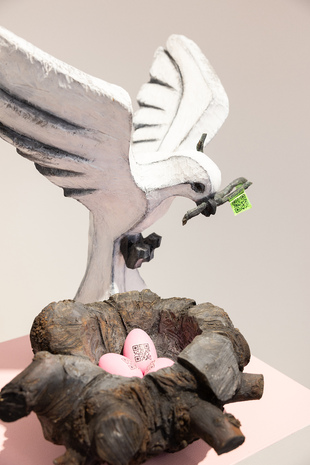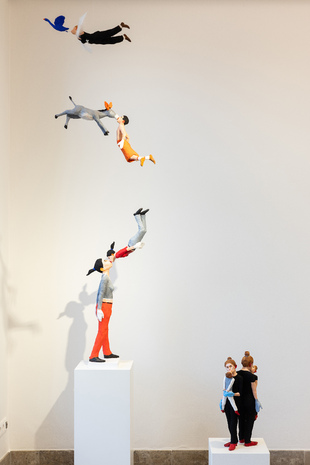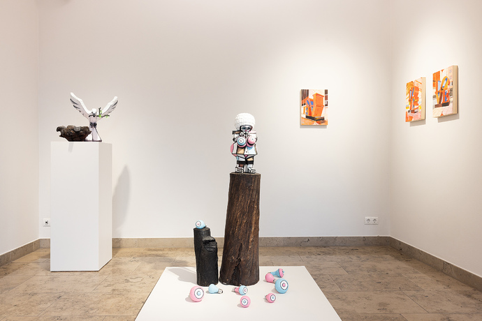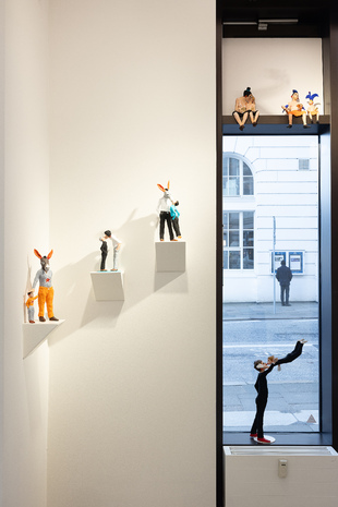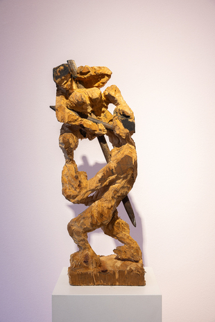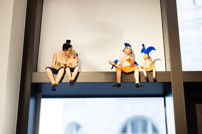 Seine neueste Werkserie Kussmuss entstand in der Auseinandersetzung mit den Auswirkungen der Pandemie, die körperliches Berühren verhindert, erschwert und unbeholfener gemacht hat, obgleich wir die körperliche Nähe eines geliebten Menschen herbeisehnen. Der Kuss muss sozusagen passieren, wir können nicht ohne. Die sich Küssenden stehen also für eine Sehnsucht, einen Trieb und das gesellschaftliche Entfernen davon. Sie sind Ausdruck unserer Fähigkeiten zu lieben. Und damit auch Hoffnungsträger.
