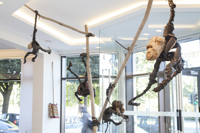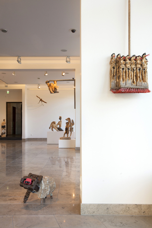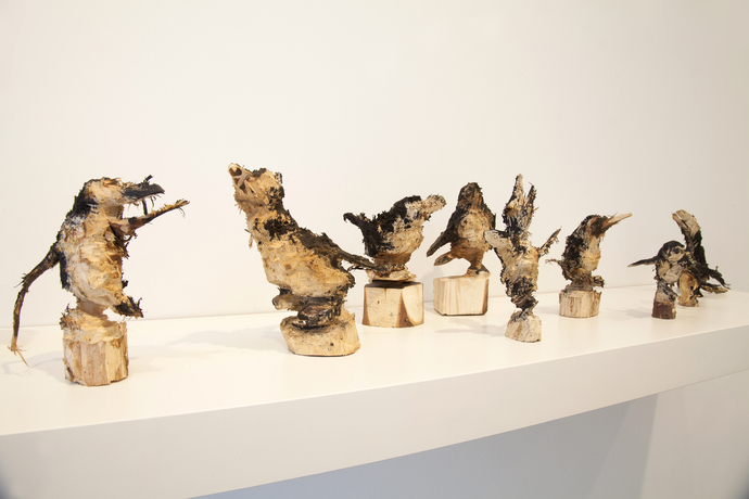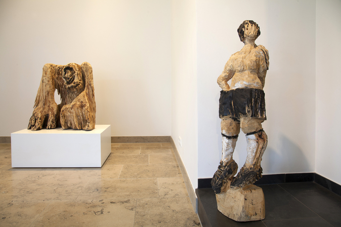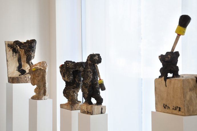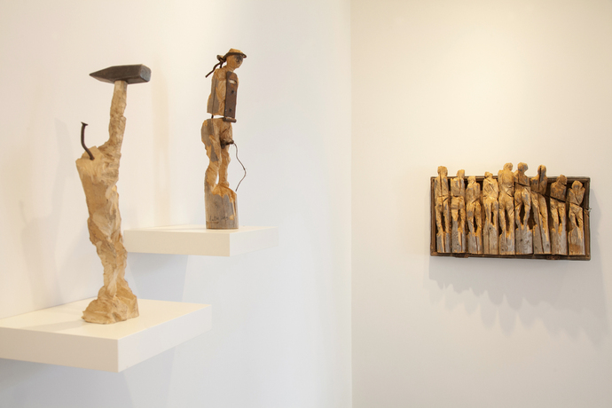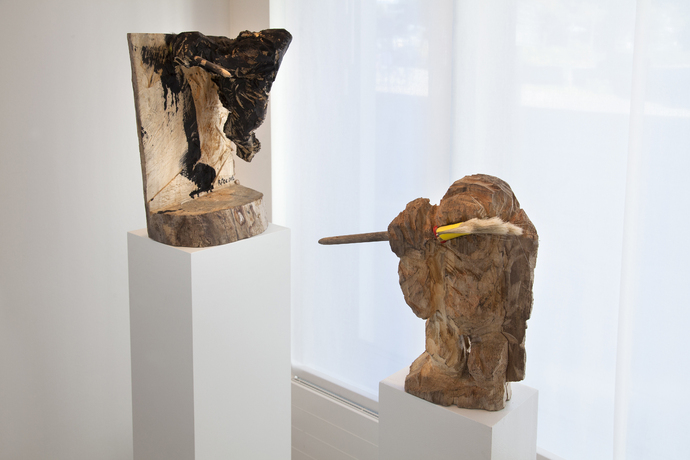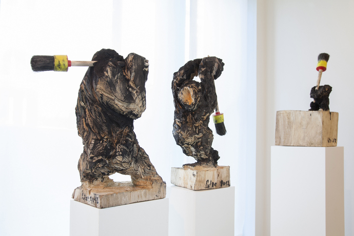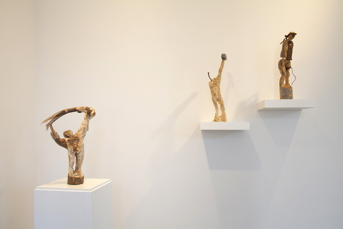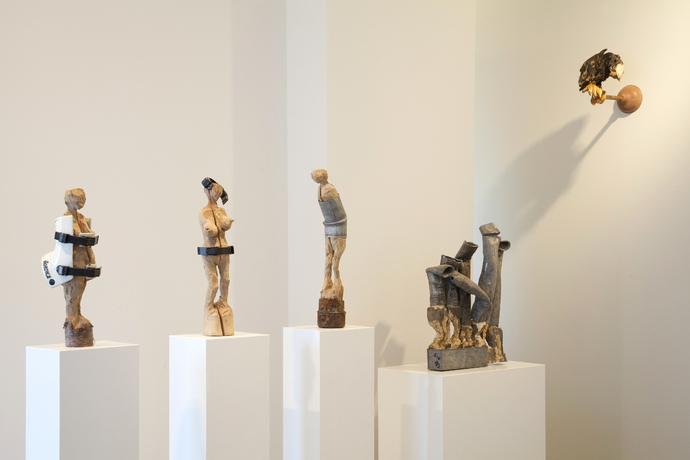 In seiner ersten Einzelausstellung in der Stern-Wywiol Galerie konfrontiert uns der Stuttgarter Künstler Thomas Putze, geb. 1968, mit seinen Mischwesen aus Holz und Zivilisationsabfällen. Was auf den ersten Blick burlesk erscheint, verweist auf den zweiten Blick auf eine Auseinandersetzung mit philosophischen und kunsttheoretischen Fragen und stellt eine intelligente und humorvolle Gesellschaftsanalyse dar.