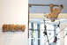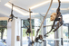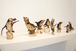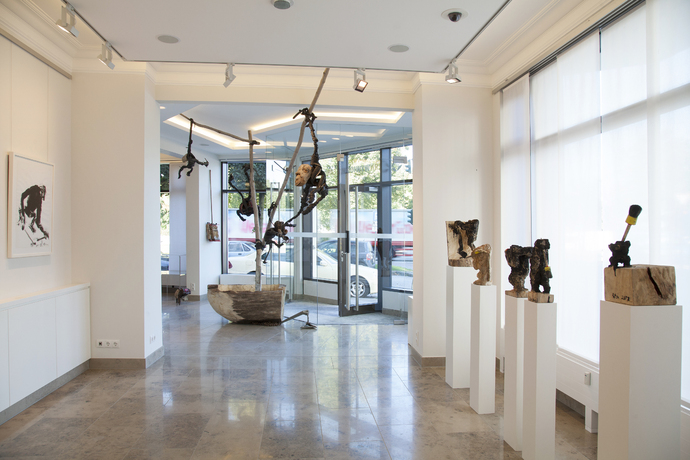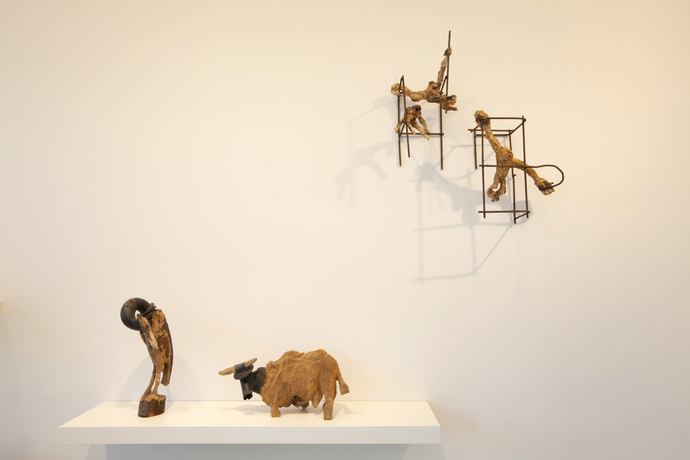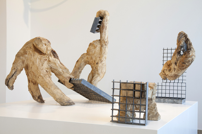 Hals über Kopf stürzen sich Thomas Putzes Figurenerfindungen ins Leben – obwohl sie sich nur aufrecht halten können, weil sie sich ein Seil zwischen die Beine klemmen, wie Ecce Homo, oder nur gebeugt laufen können wie die Geknickte oder viel zu dünne Beine für ihren massigen Körper haben wie der Mops. Selbstbewusst stellen sie sich ihrem Schicksal entgegen, behaupten sich und lassen offen, ob die vermeintlichen Ersatzteile ein Handikap oder ein Hilfsmittel darstellen. Ähnlich ambivalent sind auch die Affen in Käfigen. Die Gorillas und Gibbons spielen mit den Gittern, basteln sich neue Wege oder schieben sie einfach weg. Sind die Gitter Spielzeug, Stütze oder Gefängnis? Beobachten wir die Tiere oder sie uns?